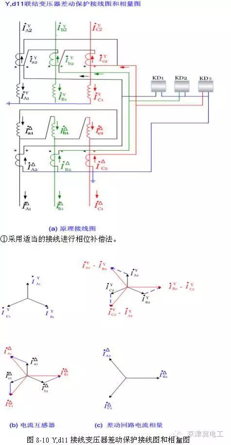 如变压器为Y,d11接线其相位补偿的方法是将变压器星形侧的电流互感器接成三角形,将变压器三角形侧的电流互感器接成星形,如图8-10(a)所示,以补偿30°的相位差。图8-10(b)为星形侧的一次电流和三角形侧的一次电流,及其相位关系。采用相位补偿接线后,变压器星形侧电流互感器二次回路侧差动臂中的电流分别为(右上图红色),它们刚好与三角形侧电流互感器二次回路中的电流同相位,如图8-10(c)所示。这样,差动回路中两侧的电流的相位相同。
