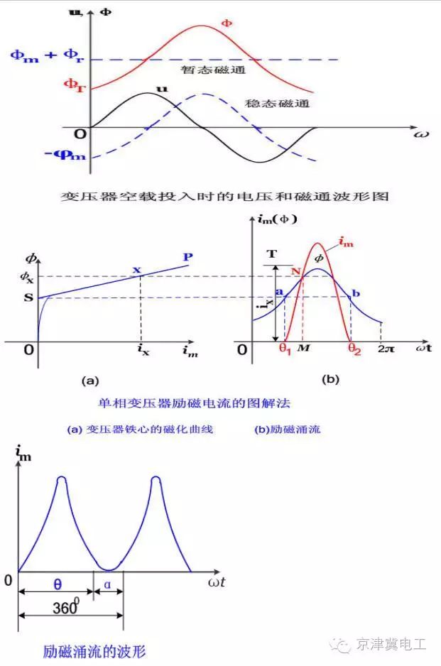 ①励磁电流数值很大,并含有明显的非周期分量,使励磁电流波形明显偏于时间轴的一侧。
